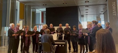 Koret var inviteret til at synge i det nye mediehus i Aarhus, DOKK1 i september. Det var svært at synge i det store rum.